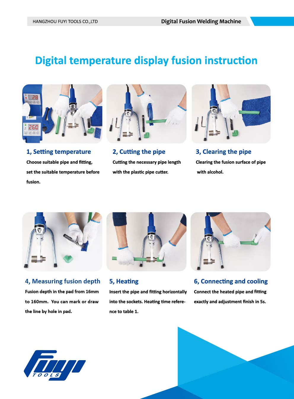 Como usar a máquina de solda por fusão de soquete digital 1. Configuração da temperatura Escolha tubos e conexões adequados, defina a temperatura adequada 2. Corte do tubo Corte o comprimento necessário do tubo com o cortador de tubos de plástico. 3. Limpeza do tubo Limpeza da superfície de fusão do tubo com álcool 4. Medição da profundidade de fusão Profundidade de fusão na almofada de 16 mm a 160 mm. Você pode marcar ou desenhar a linha por furo no bloco. 5. Aquecimento Insira o tubo e encaixe horizontalmente nos encaixes. Referência do tempo de aquecimento no livro de instruções do kit. 6. Conexão e resfriamento Conecte o tubo aquecido e a conexão exatamente e ajuste o acabamento em 5s.
